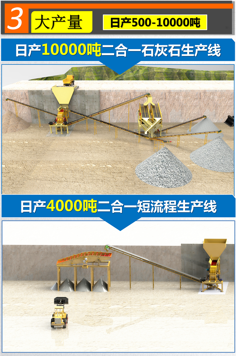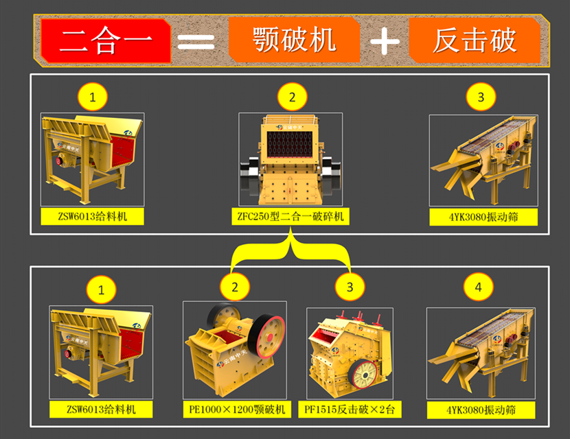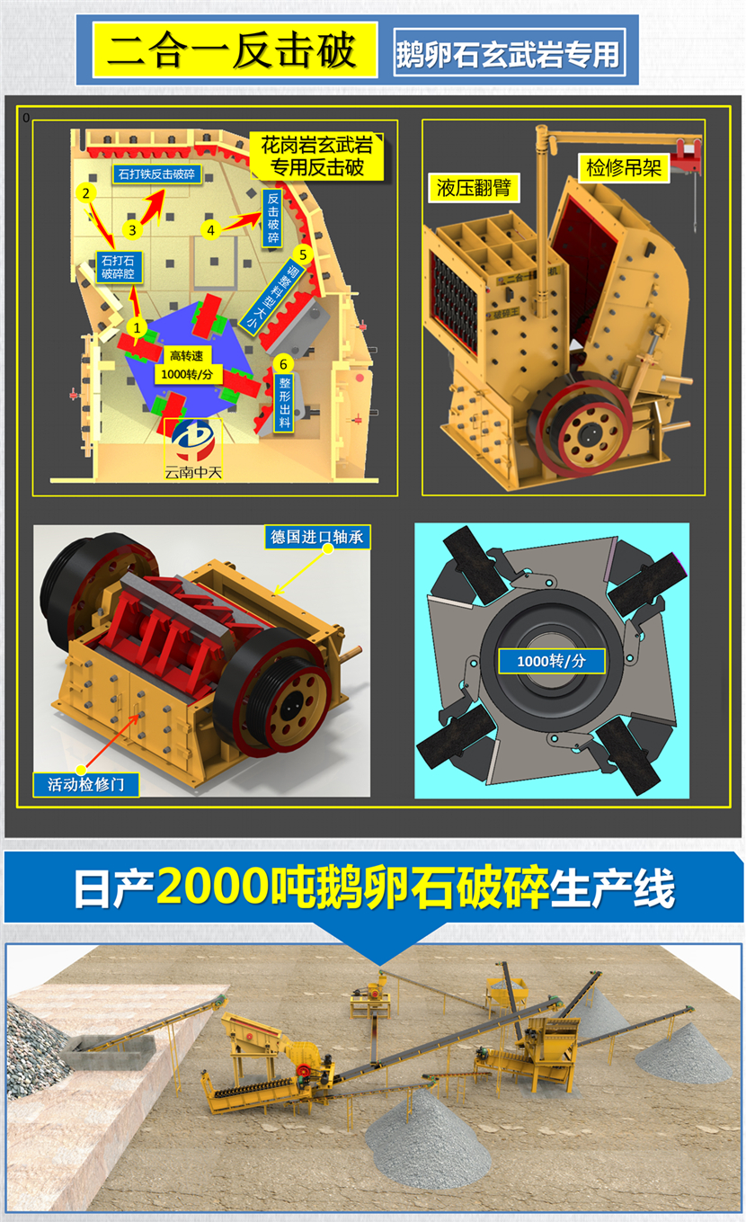 2、可作二破用,大型顎破選配小型二合一破碎機(jī),作新型反擊破用。