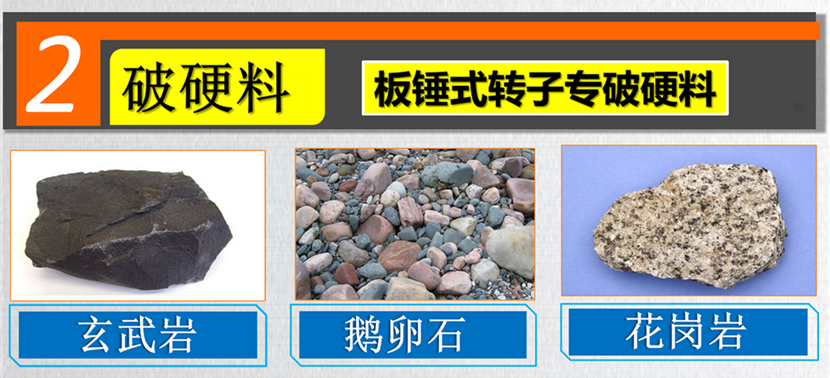 可破碎花崗巖、玄武巖、鵝卵石、鐵礦石等高硬度、磨損大的物料。破碎硬質(zhì)石料選用鑲大金牙錘或者同時(shí)澆鑄的硬質(zhì)合金錘,也可選用反擊式板錘。