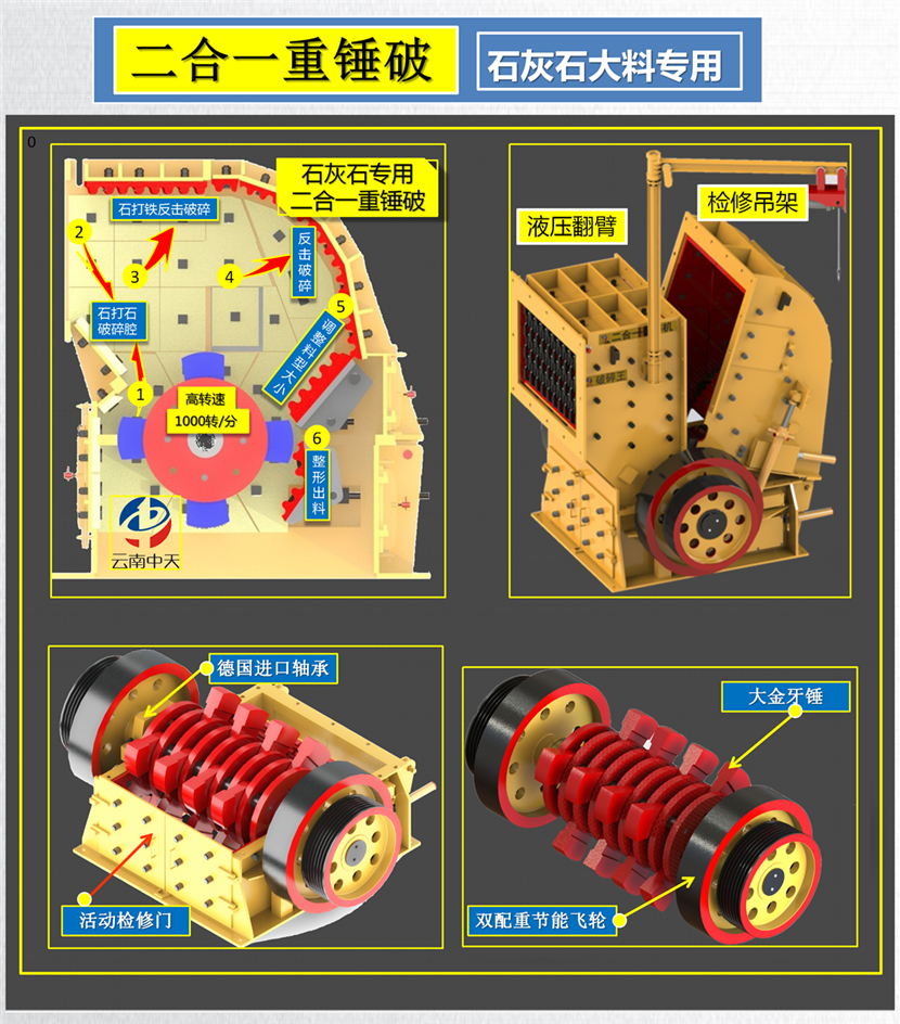 可破碎花崗巖、玄武巖、鵝卵石、鐵礦石等高硬度、磨損大的物料。破碎硬質(zhì)石料選用鑲大金牙錘或者同時(shí)澆鑄的硬質(zhì)合金錘,也可選用反擊式板錘。