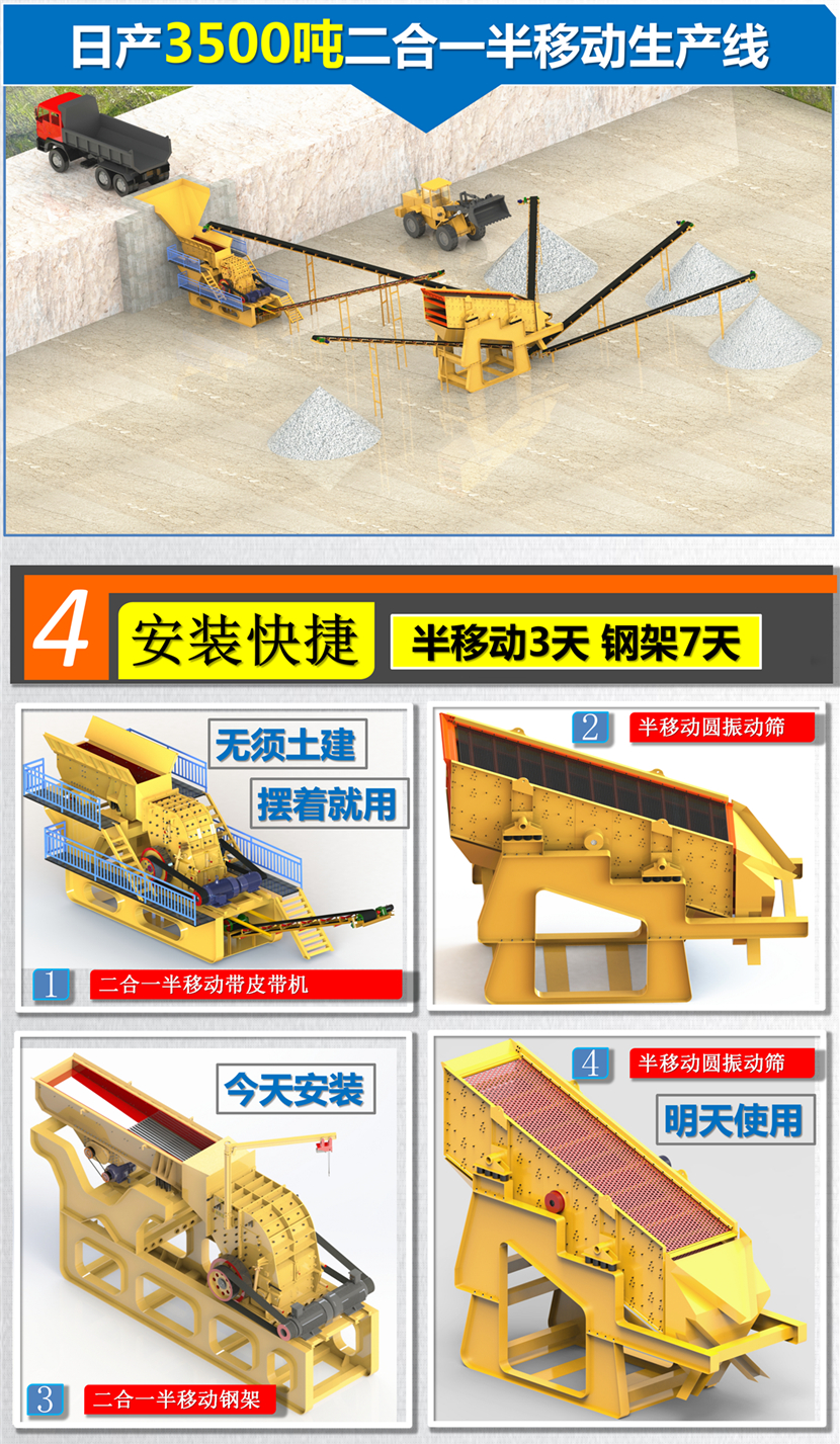 普通石料除錘頭和反擊襯板外,整個(gè)使用過程基本不用更換配件(沒有比二合一更省配件的破碎設(shè)備)。